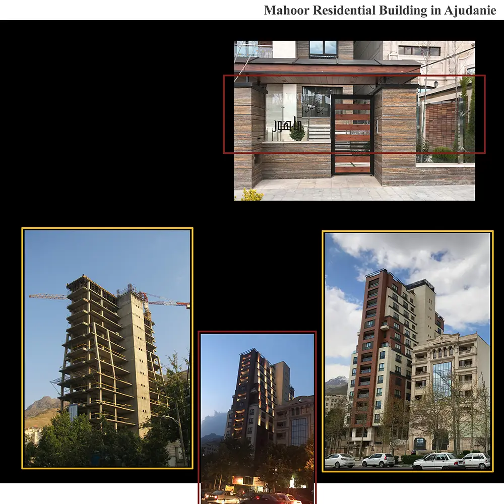 - The facade of the project is one floor of silver date travertine, white travertine, and the upper floors are a combination of cement, Arak fused bricks and Austrian FunderMax HPL.